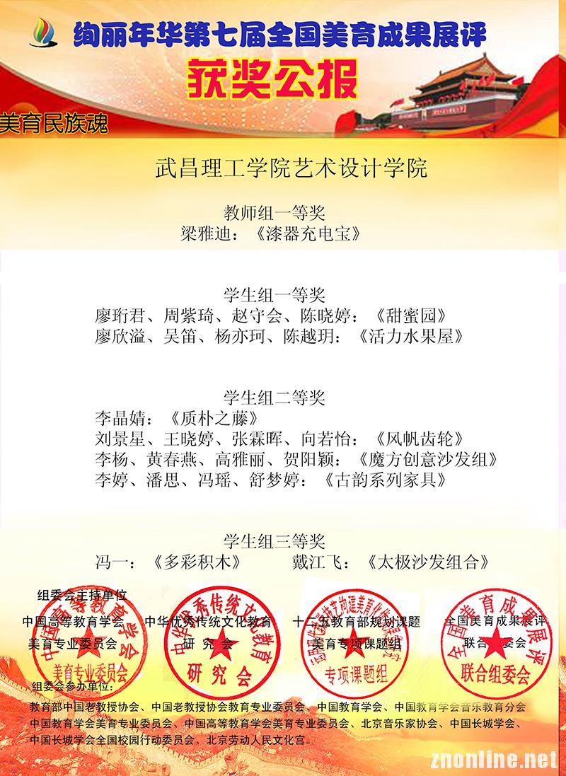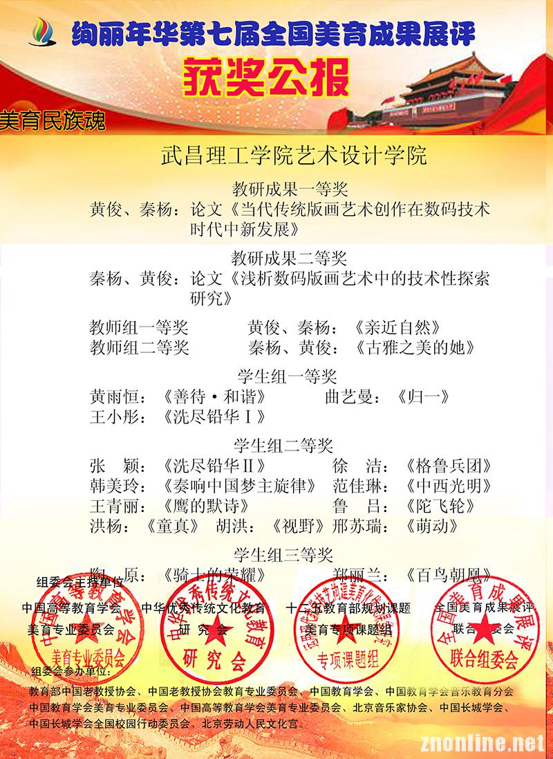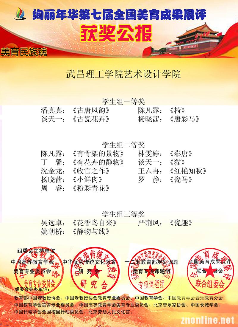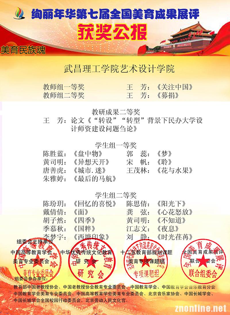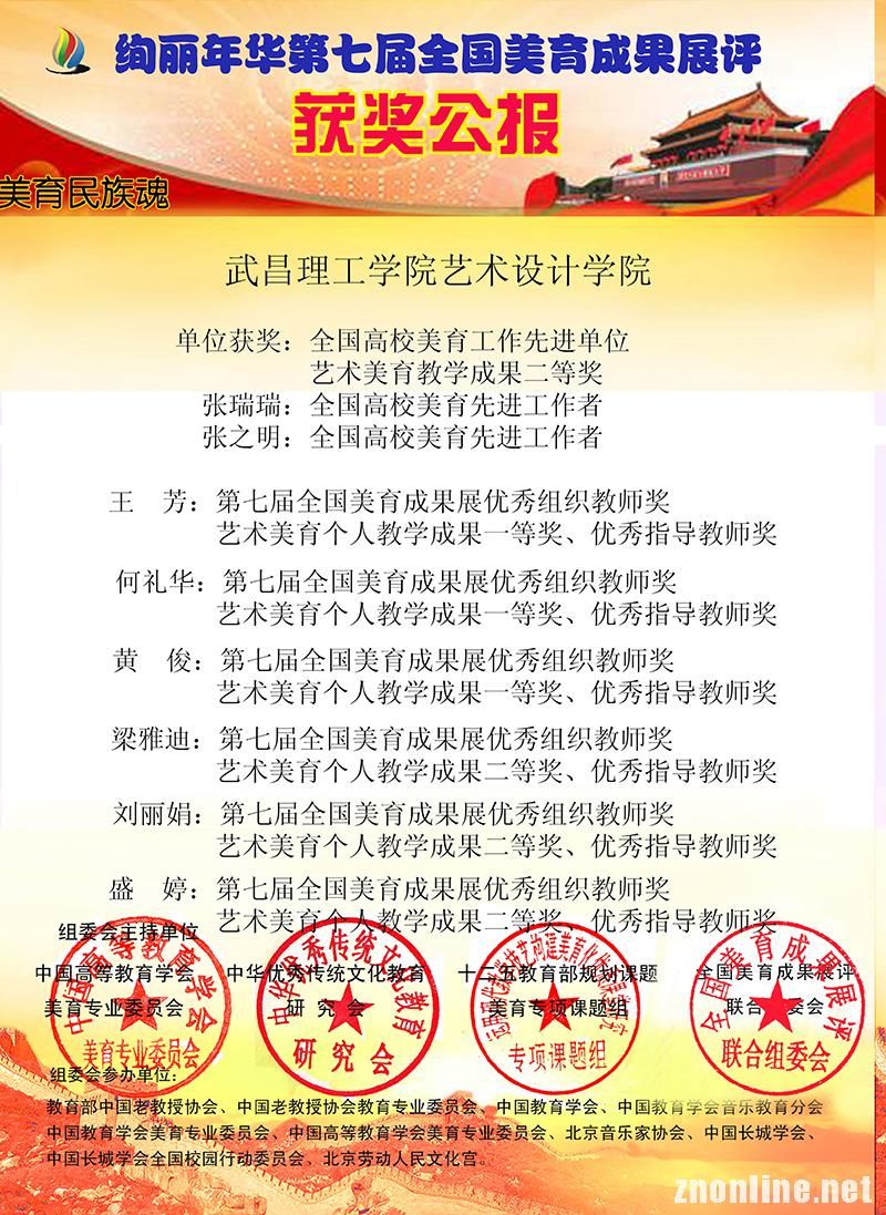 中南在线1月8日消息(记者 梅高强 报道)日前,第七届“美育民族魂·全国美育成果展”系列活动评选结果揭晓。武昌理工学院师生斩获多项佳绩。该校艺术设计学院荣获全国高校美育工作先进单位荣誉称号并获得艺术美育教学成果二等奖,该院院长张瑞瑞教授及张志明教授荣获全国高校美育先进工作者称号,王芳、何礼华荣获艺术美育个人教学成果一等奖,黄俊、梁雅迪、刘丽娟、汪燎等7位教师获得第七届全国美育成果展优秀组织教师奖和优秀指导老师奖。参赛师生共获教师组35个奖项,其中一等奖8个;学生组108个奖项,其中一等奖24个。此次活动从2014年3月开始征集作品至11月底结束,从来自全国各地高校投稿的1260封邮件一万余幅作品进行了评比。其中设计组评委在2638幅参赛作品中精选出了588幅作品入围终评的角逐。