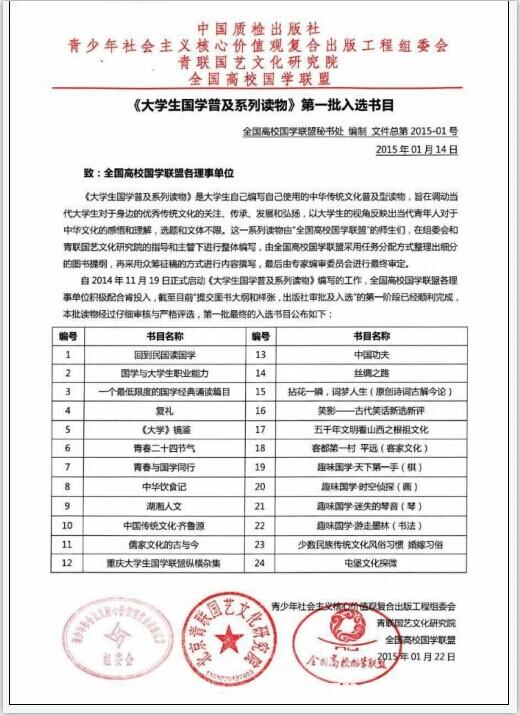 《大学生国学普及系列丛书读物》是在国家质检总局和共青团中央的指导下,由青少年社会主义核心价值观复合出版工程组委会主要负责,将社会主义核心价值观与国学传统文化精粹有机结合共同发展,并由大学生自己编写自己使用的中华优秀传统文化普及型读物,旨在调动当代大学生对于身边的传统文化的关注、传承、发展和弘扬,以大学生的视角反映出当代青年人对于中华文化的感悟和理解。