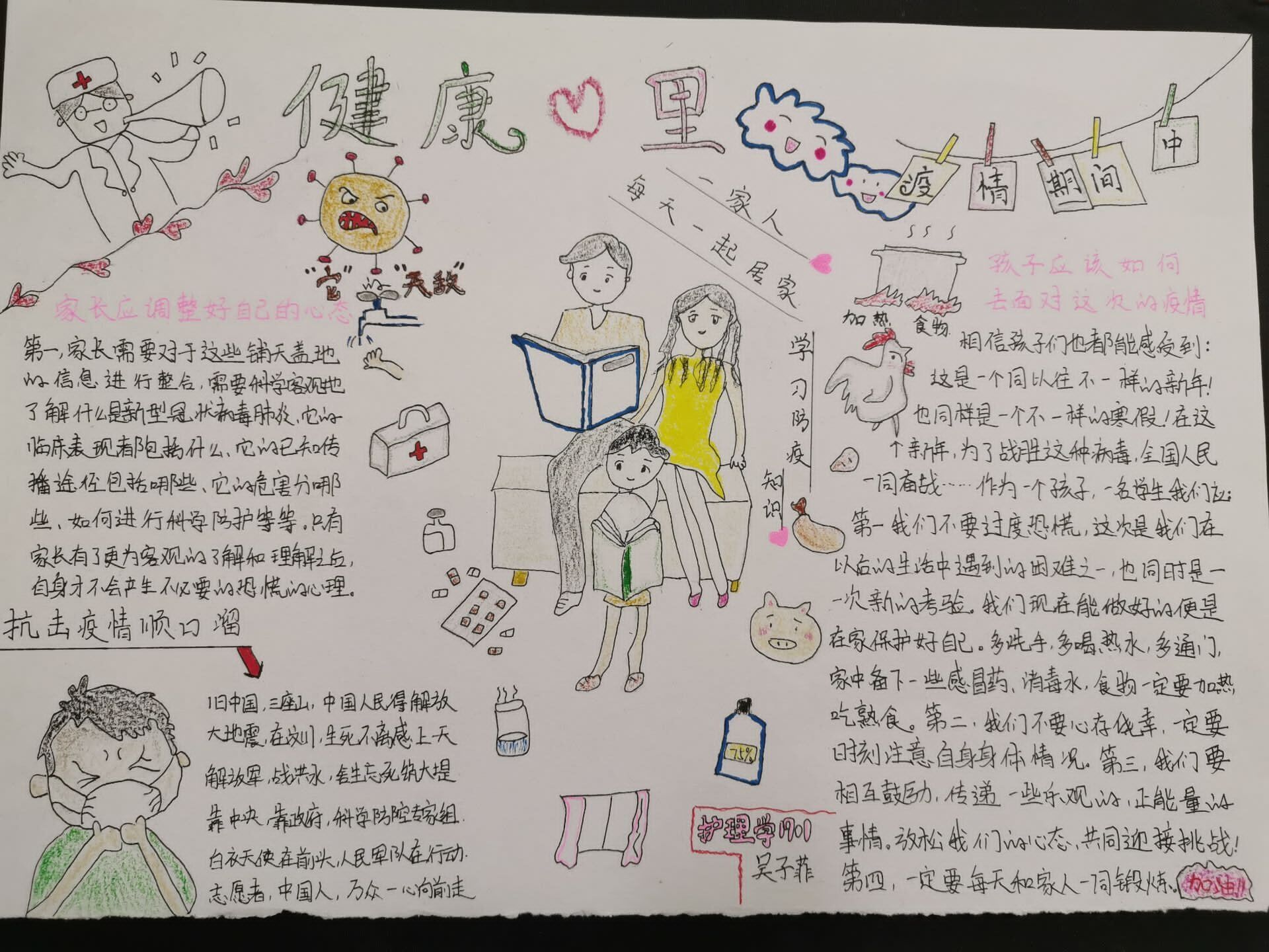 在每晚的晚安推送中,伴随着莫扎特等著名音乐家的钢琴曲让同学们沉下心来,利用课余时间看看《放牛班的春天》等电影和帮助调节心理的书籍来放松身心,慢慢抚慰了同学们的心灵,促进了同学们的心理健康,让同学们在疫情期间善待自己。护理学1901班的吴子菲,用彩色的画笔生动地描绘了一幅一家人在一起学习防疫知识的图画,画面温馨而又美好。护理1802班的王唯怡,用最真诚的话语在图纸上写下了“武汉加油”。此次活动吸引全院同学们踊跃参与,积极抒发自己内心真实的感受。
