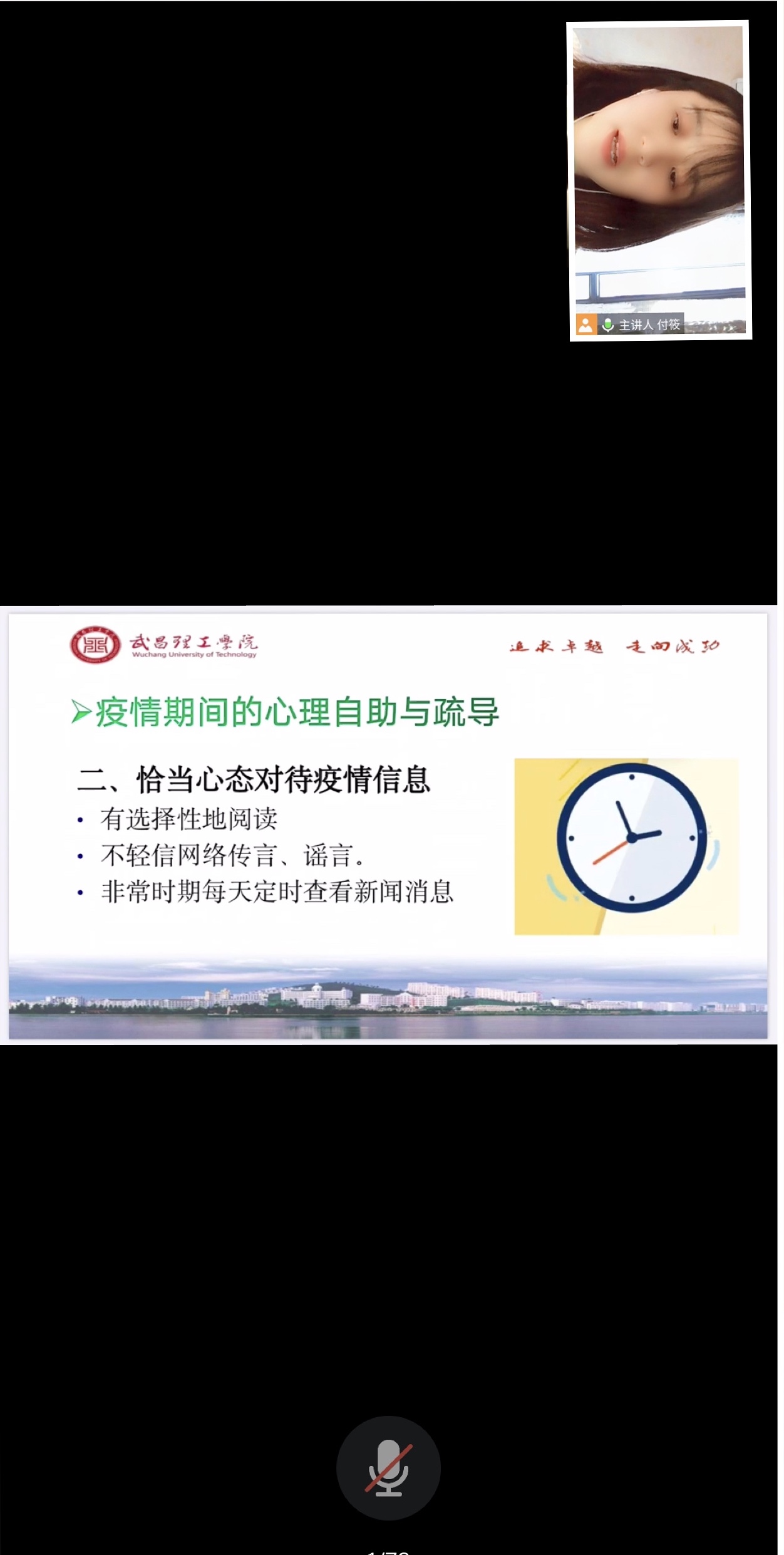 5月19日晚7点,在“后疫情时期大学生的心理调适“专题辅导报告中,心理健康教育中心付筱老师从正确认识自己的心境反应、恰当心态对待疫情信息、积极和相关人士展开沟通、维持稳定健康的生活方式以及其他疏导方法这五个方面向同学们介绍如何进行心理调适。讲到疏导方法时,付老师讲解了如何通过积极联想法和各种放松训练去改善心态保持、解除肌肉紧张保持全身放松的感觉;同时还介绍了通过情绪宣泄和调整认知来自助与疏导,最后付老师提倡有条件的同学们多做有意义感和有价值感的事情来对抗自身的失控感与焦虑感,提升自我肯定与自我表扬,从而增强对环境的控制感。