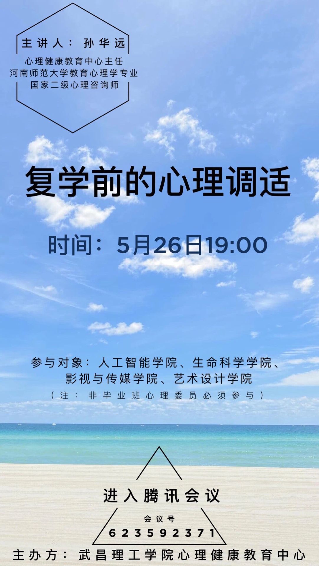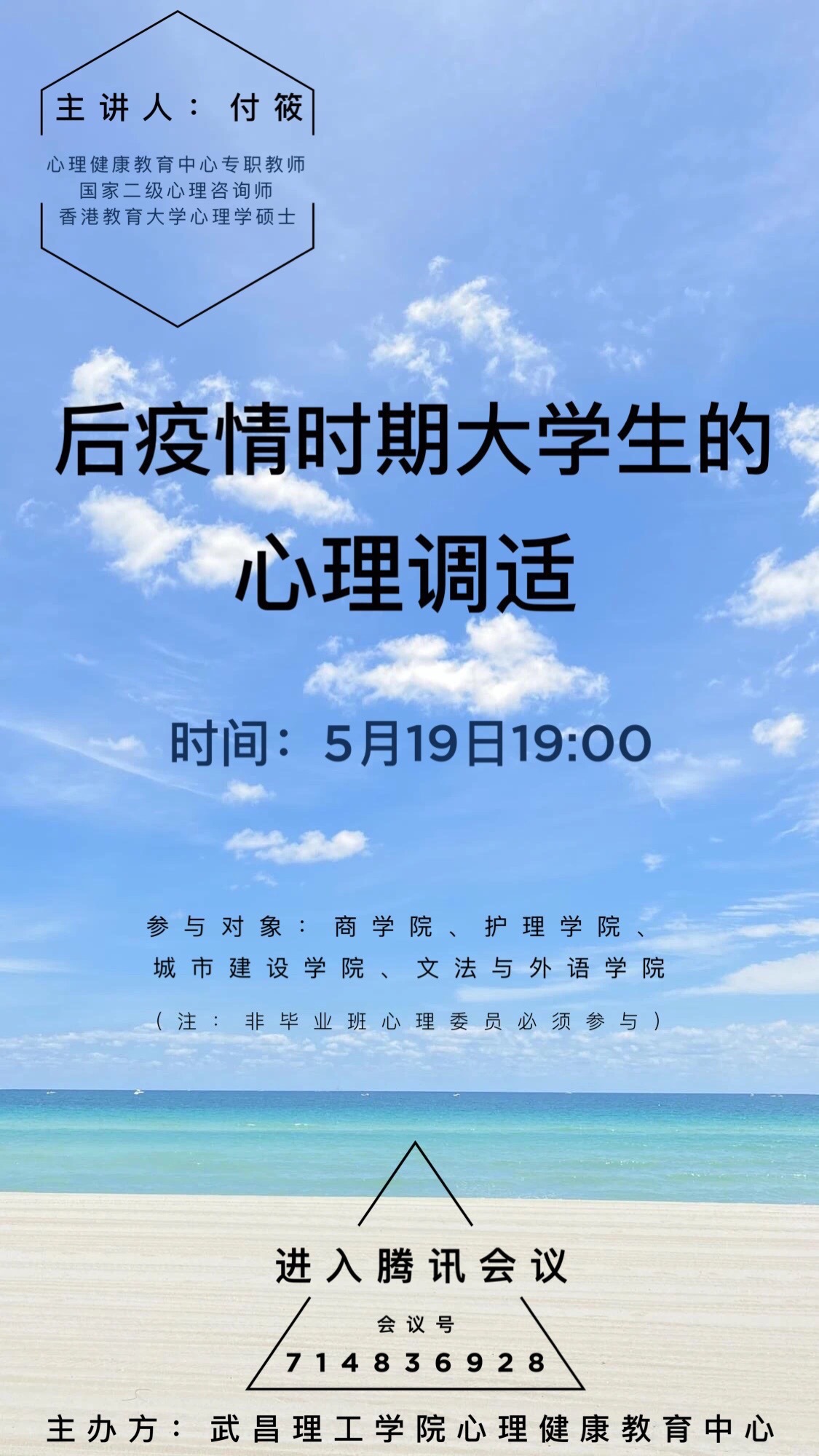 2020年新冠肺炎病毒来势汹汹,在这100多天的时间中,新冠疫情持续影响着同学们生活的方方面面,不仅威胁着同学们的生命安全,也影响着同学们的心理健康状况。为进一步提高我校心理健康教育工作水平,构建和谐校园,武昌理工学院心理健康中心于5月15日至5月31日开展“5•25”大学生心理健康教育月系列活动。通过直播方式面向全校有需求的学生开展由“后疫情时期大学生的心理调适”和“复学前的心理调适”两场线上专题辅导报告。