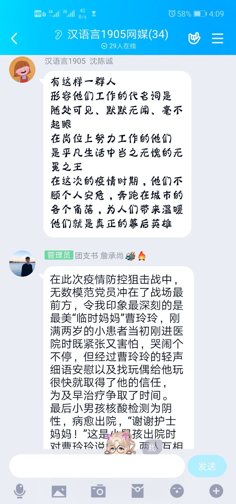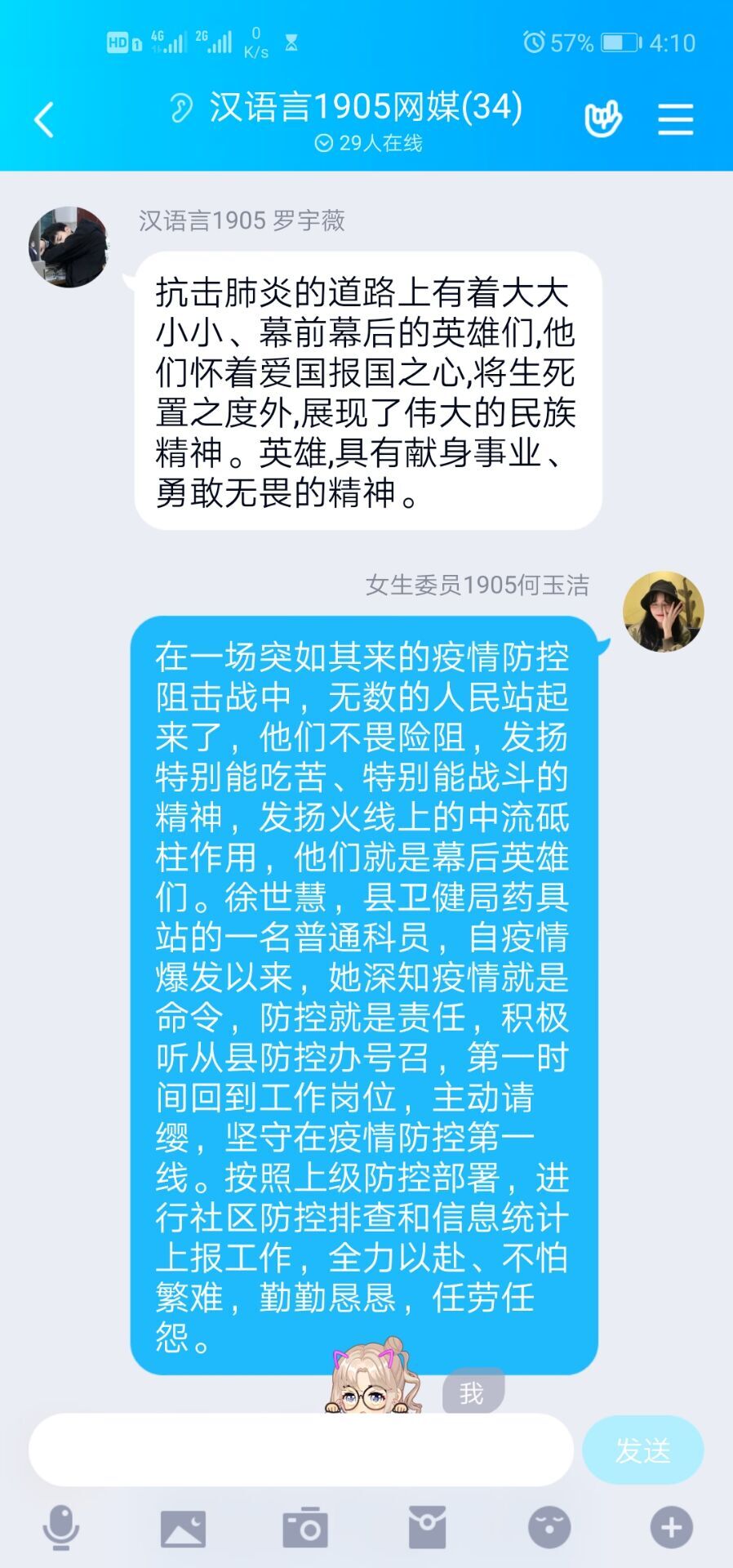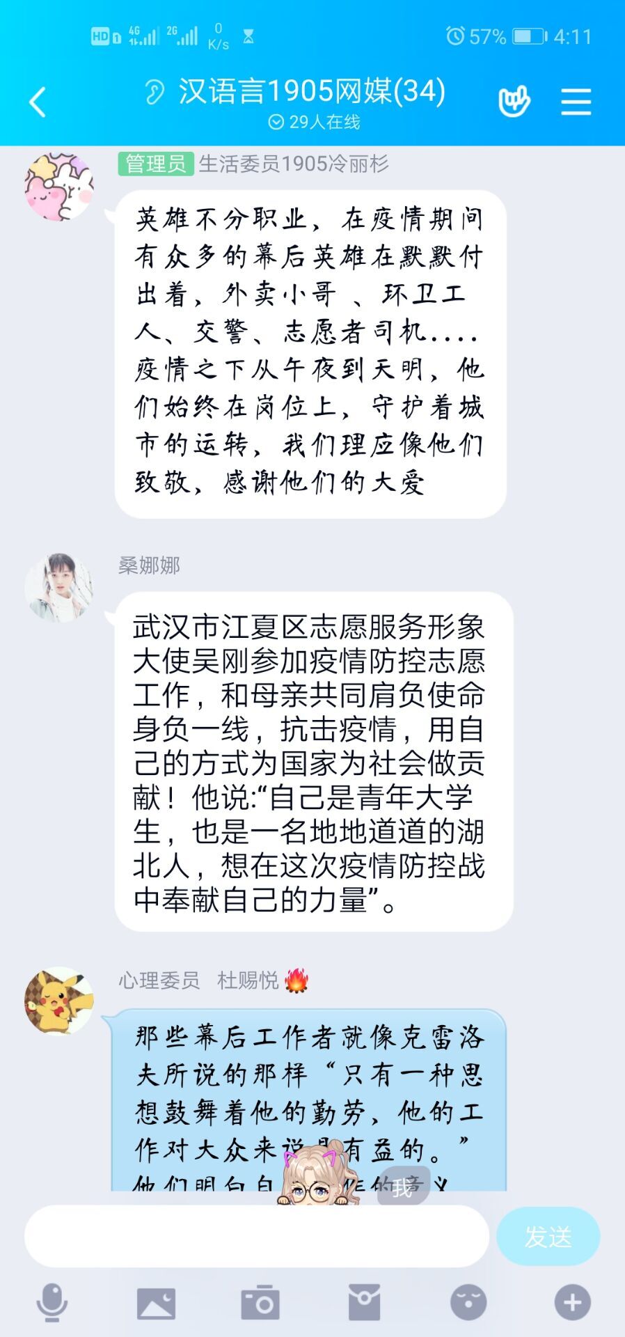 活动伊始,每个小组的成员积极发表自己的看法,“幕后英雄就是像我们村大队队长,每天风雨无阻的在大队放防疫宣传话语,督促村民,在家休整,不放大家出去,此乃真英雄也,用自己的辛苦付出,保证村民的生线。”“关于幕后英雄,我想到了这次疫情里面的火化工作者。火化同样面临着很大被感染的危险,工作量也很大,但是对他们的报道真的少之又少。希望他们平平安安。抗疫前线,值得我们尊敬。”“我看到许多幕后工作者默默的做着自己的奉献。我们这里的韩老师每天都背着一个很大的装着消毒液的喷雾器到处消毒,看起来很沉重,他应该是很辛苦的,但他仍然坚持每天为这里消毒。像他一样的幕后工作者得不到光荣,也得不到表扬,他们同样值得我们敬佩。”“疫情当下,医护人员在鬼门关与死神抢人,那就有人在为白衣天使擦汗鼓劲。雨衣妹妹——盒悦老板娘为前线的医护人员无偿提供盒饭,风里雨里,疫情再险,热乎乎的饭总能准时到医护人员手中,这就是幕后英雄的责任与担当。”大家积极分享着自己的理解与感悟,并纷纷表达对这些平民英雄的感激之情,此次特色主题活动在热闹的讨论中落下帷幕。