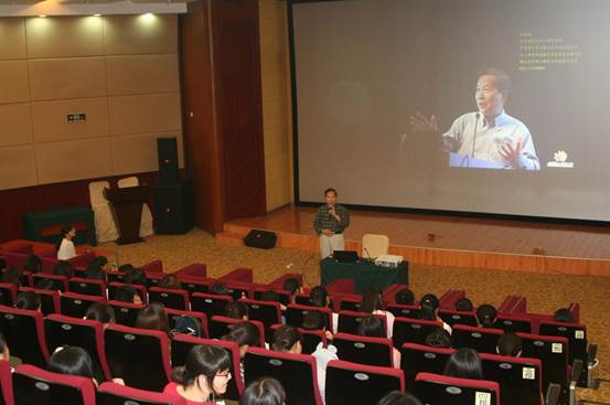 郑教授用“4S1H法”热场,让在场的师生两两结对,按照“see、smile、speak、shake、hug”五个步骤让彼此感受幸福之美。讲座过程中,郑教授深入浅出、风趣幽默,结合当今社会时事热点,从心理学专业角度,给大家讲解了冰山理论、人格发展八阶段、幸福感、幸福力等心理学理论,强调了心理健康对中国大学生学习和生活的重大影响。作为知名的心理学辅导专家,郑教授告诉我们,幸福不仅是感觉,更是一种能力,幸福是可以学习的。幸福力是一个人内在的心理素养,是一个人获得幸福的软实力,是一个人的情感力、认知力、健康力、意志力、抗挫力、微笑力和德行力的综合表现。