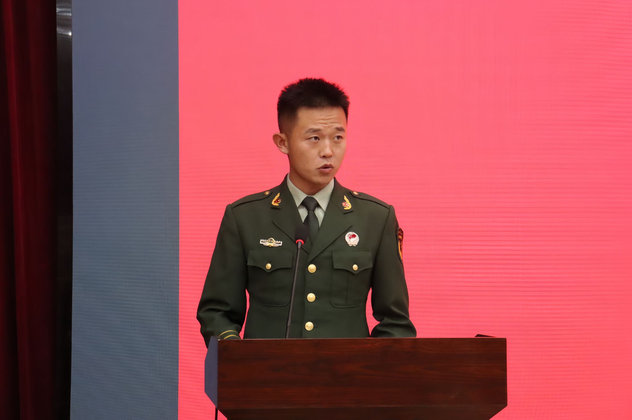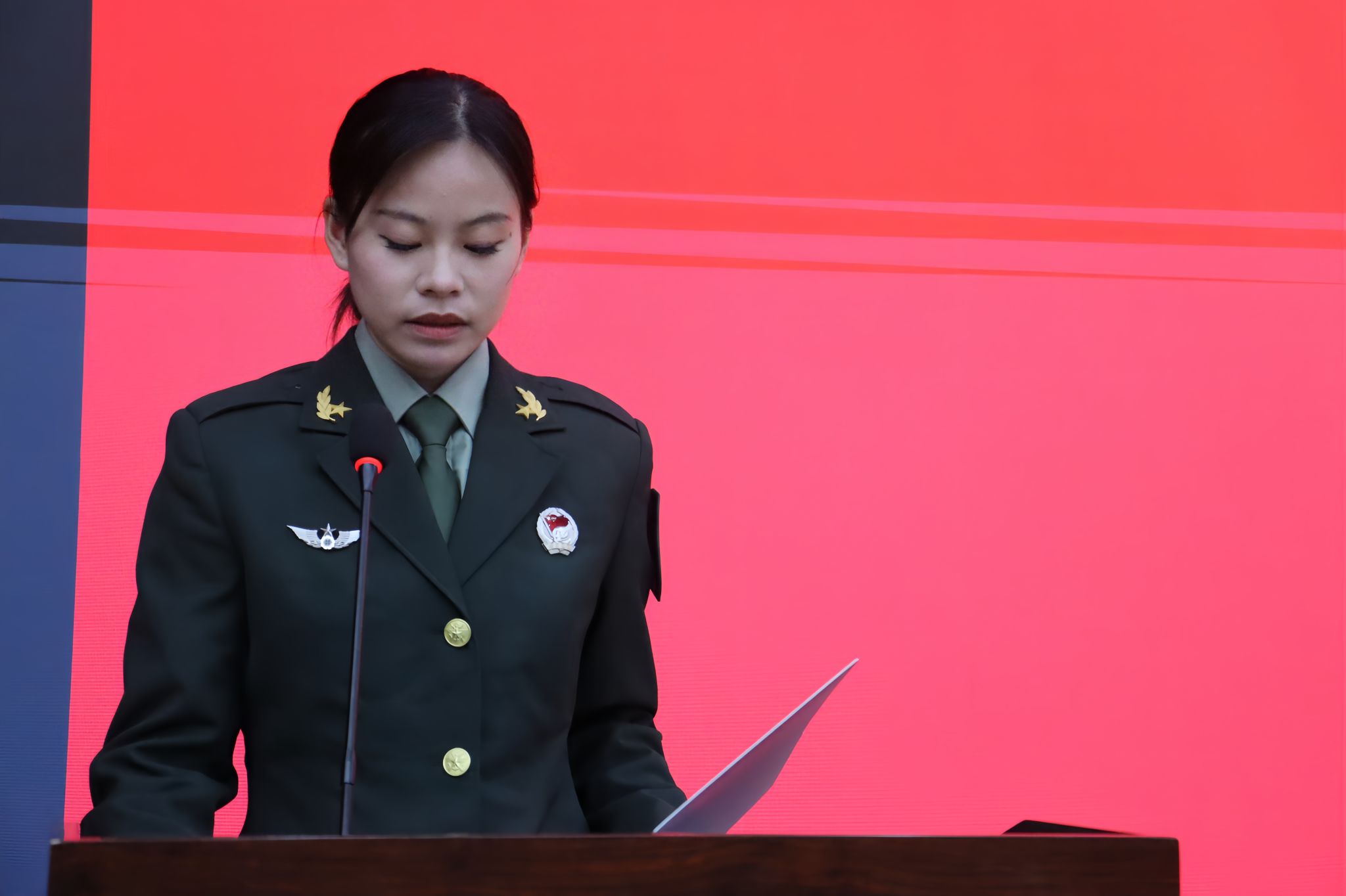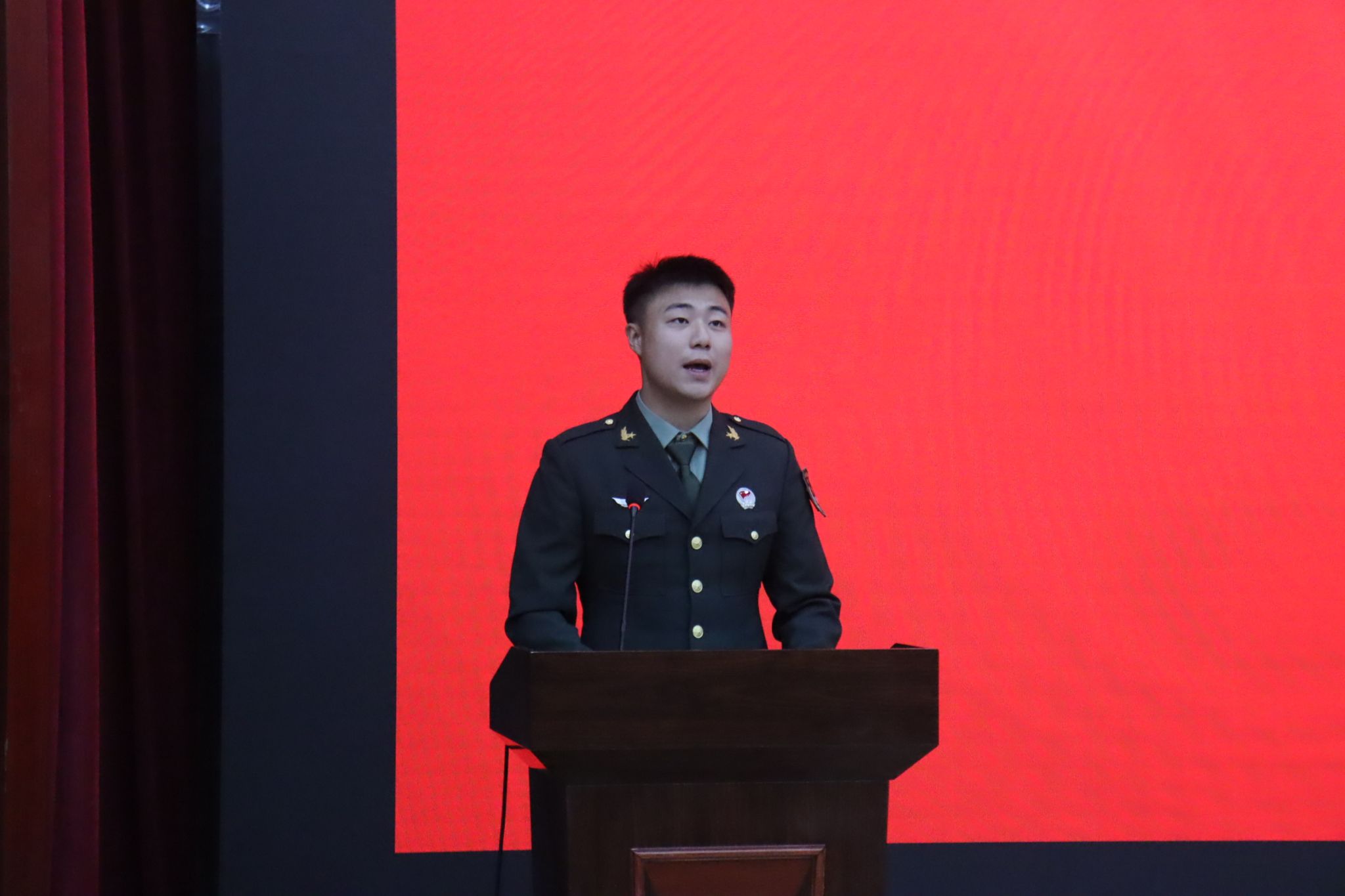 大会在庄严的国歌声中启幕,全员肃立致敬,昂扬的乐章唤起了在场众人心中深藏的爱国热情与使命责任。随后,学工处副处长、校武装部负责人温中华上台致辞。他对大学生预备连过去一年来取得的成效予以充分肯定,他说,我校预备连是有基础、有传统、有特色,尤其在新生军训中,成员以过硬素质和优良作风出色完成教官任务,诠释“退伍不褪色”的军人本色,为校园注入强大正能量,还在校园活动组织、国防知识宣传等方面积极贡献;同时对新一届骨干任职表示祝贺,寄语新一届成员传承优良作风、坚守初心,平衡学业与连队工作,以高标准要求自己、争当校园标杆,将军人坚韧品格融入校园生活,勇担使命,以实际行动彰显青年学子的家国情怀。