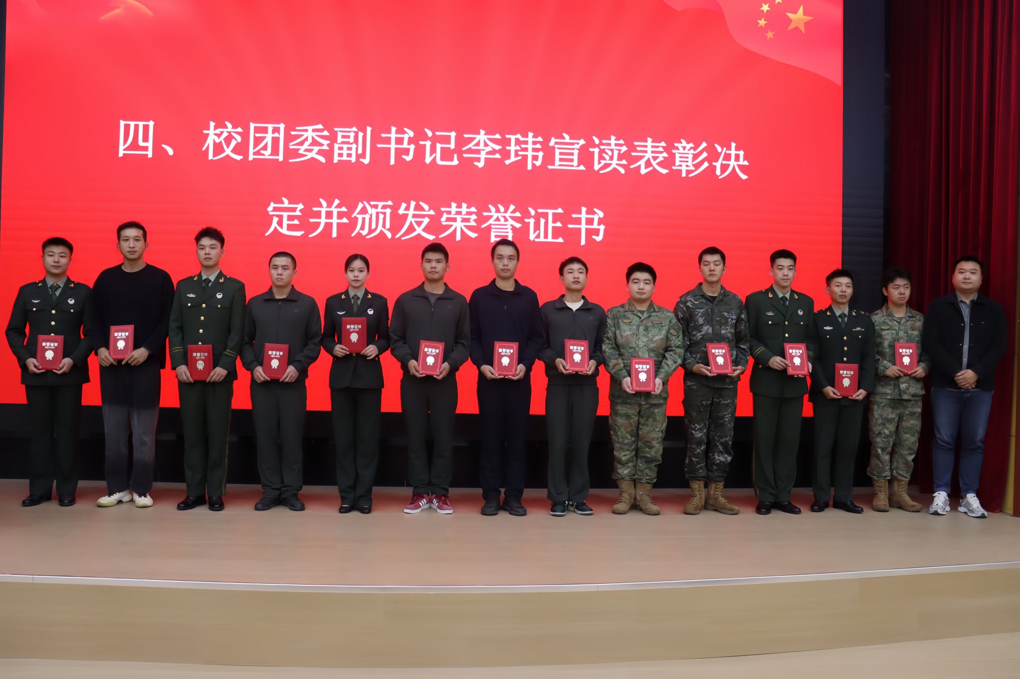 而后,校团委副书记李玮宣读军训表彰决定,对在军训工作中表现突出的优秀个人与集体进行表彰,并为获奖成员颁发荣誉证书,鼓励他们珍惜荣誉、再接再厉,继续发挥模范带头作用。紧接着,校武装部指导老师张献宣读第三届预备连学生骨干任职命令,正式任命权俊豪同学为第三届预备连连长,并为新一届骨干成员颁发聘书。